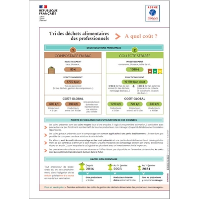 Les gros producteurs de biodéchets, et d'ici le 31 décembre 2023, l'ensemble des producteurs, y compris les ménages, sont tenus de mettre en place une ou plusieurs solutions de tri à la source des biodéchets. Deux types de solutions permettent de répondre à cet objectif règlementaire : le compostage de proximité et la mise en place d'une collecte séparée des biodéchets. A ce jour, la connaissance des modes de gestion des déchets alimentaires des producteurs non ménagers et des coûts associés est très limitée.